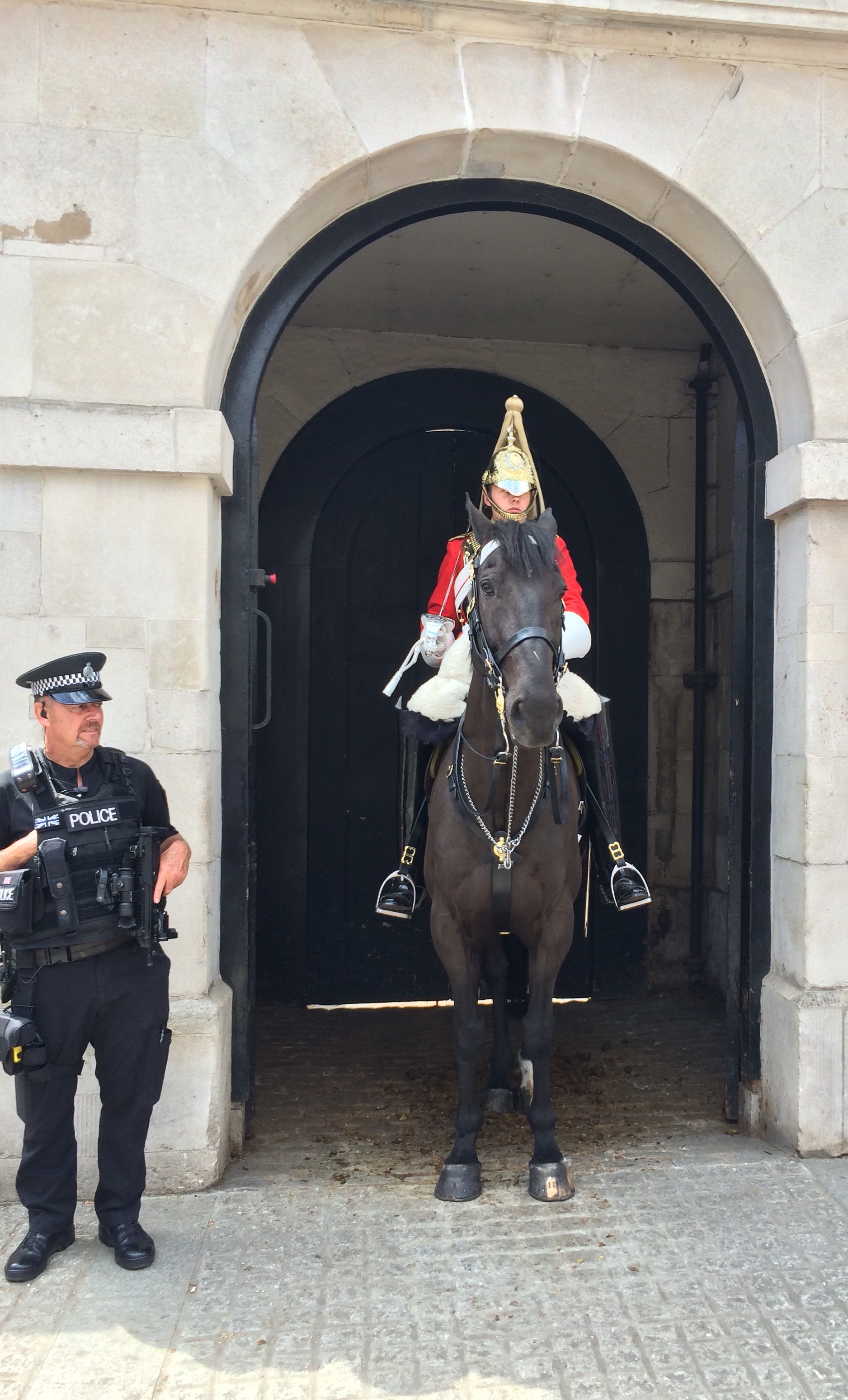Most boring job ever? Both man and horse – well practised in the art of sitting/standing perfectly still.