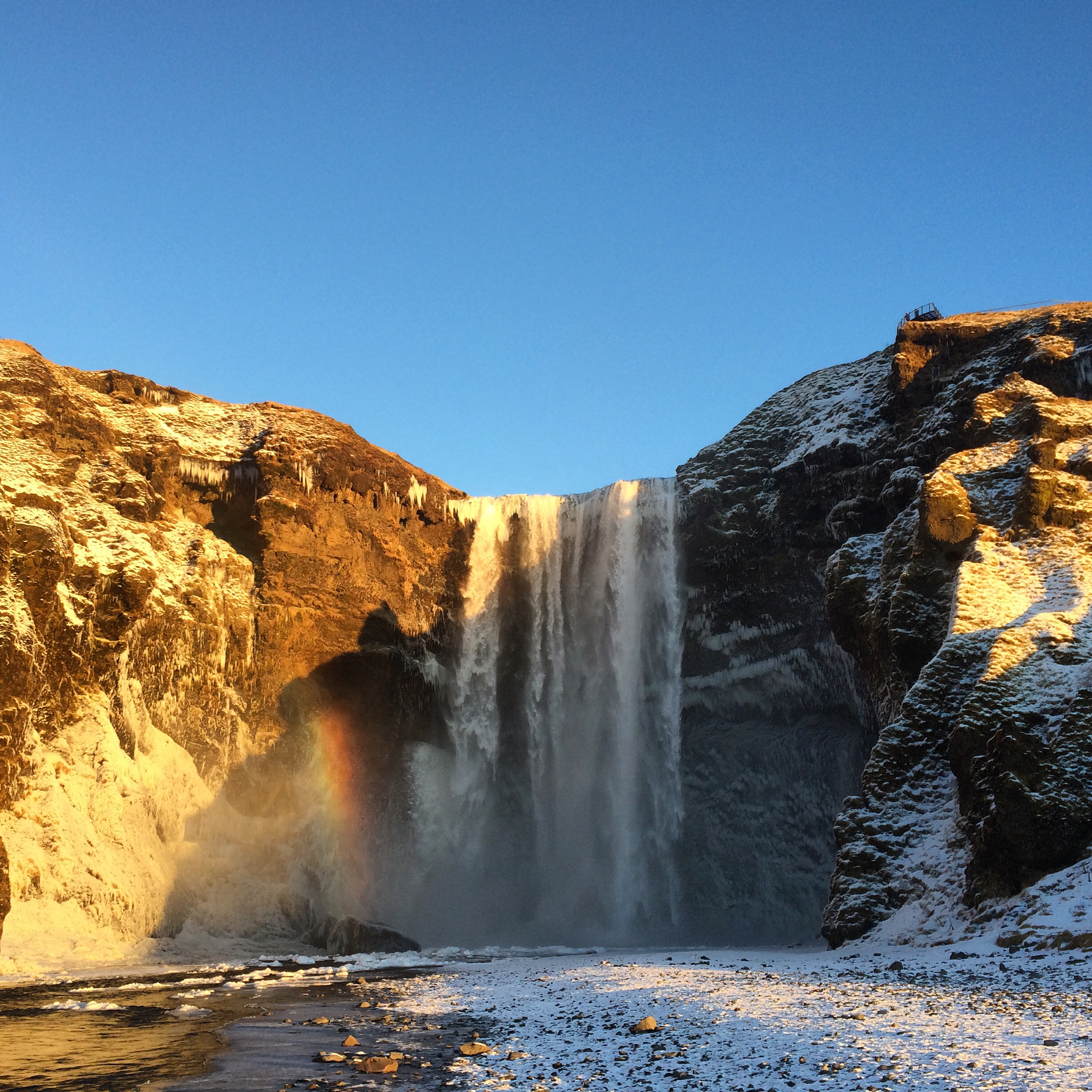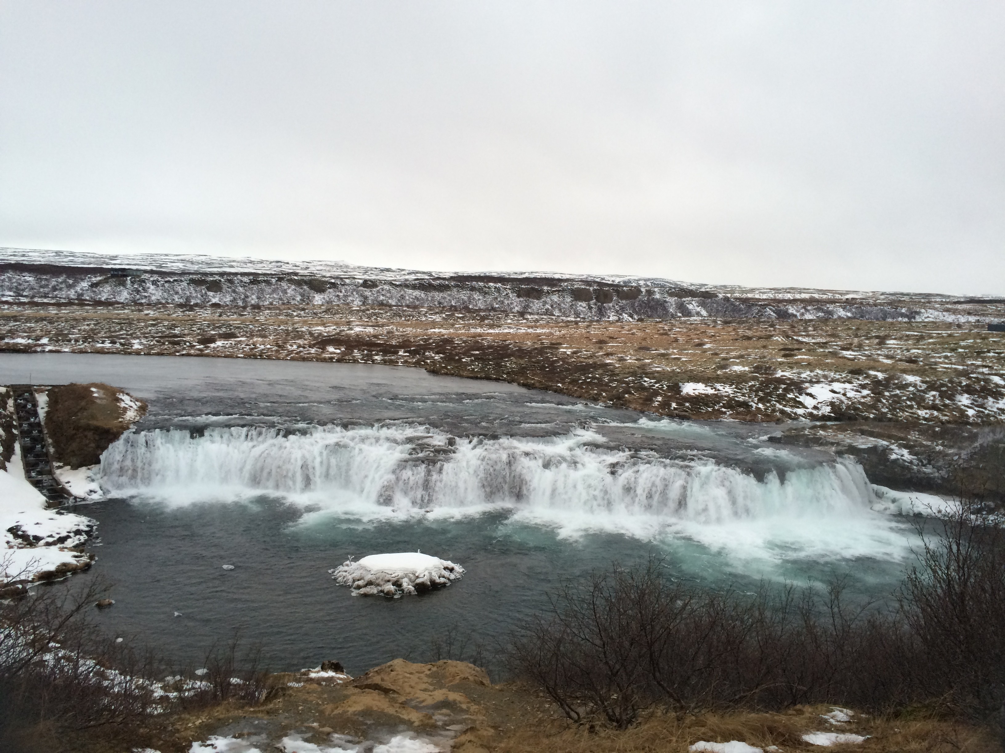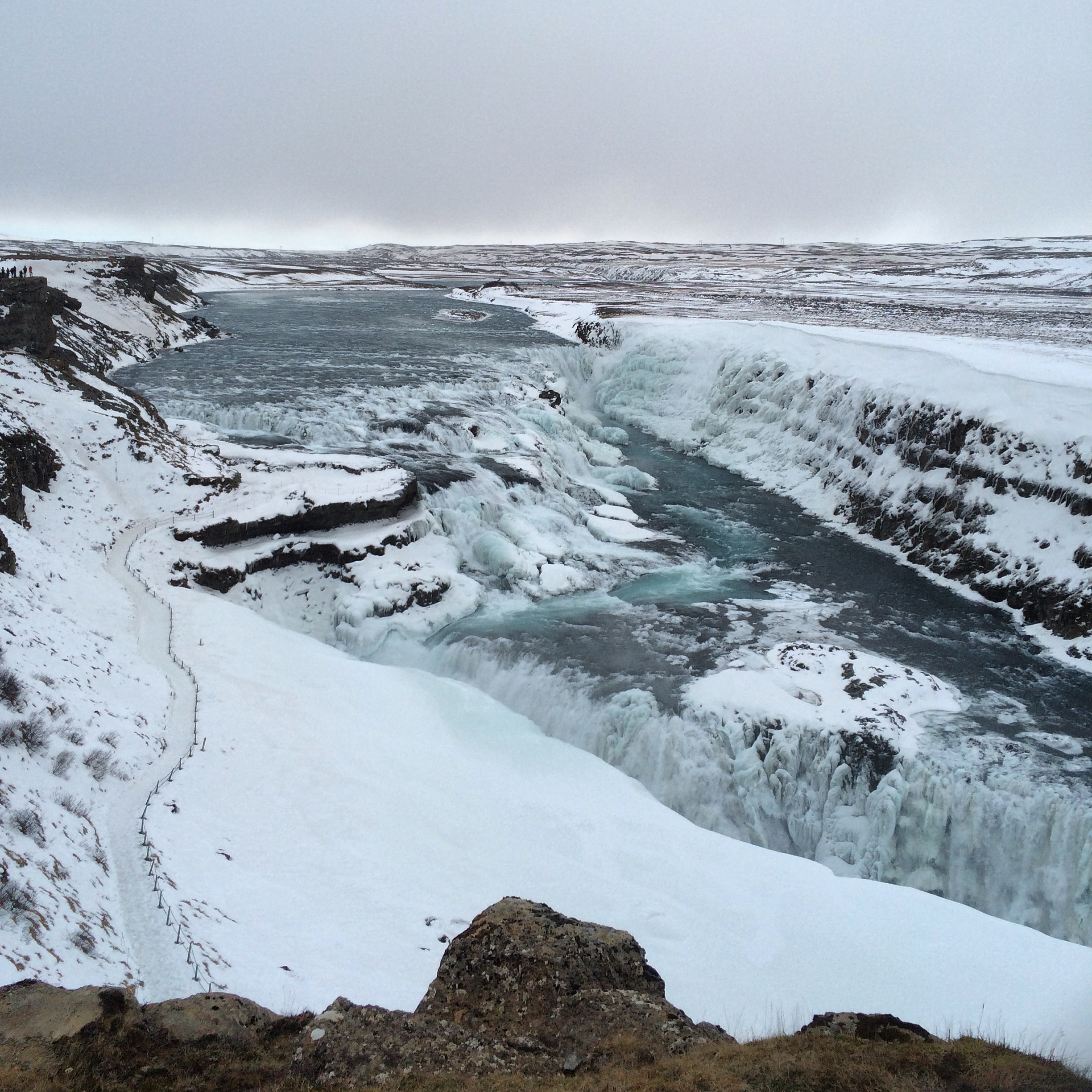 We stopped in to visit one of the more accessible waterfalls and more or less slid our way to the viewing area. Much visited, the area was well trampled and largely ice. Having never had to really deal with ice, I was rather paranoid. However, I don’t think anyone fell over. But the waterfall was beautiful, as expected, and was worth the careful treading to see properly. The waterfall bordered on a major sheep-sorting area that the farmers use to sort out their flocks which was interesting. It was basically this large ring-shaped area with compartments to herd sheep in order to figure out what belongs to who. (Iceland has a bit of a relaxed approach to sheep farming…the sheep more or less go do what they want, where they want to, when they want to. Very independent, these sheep.)
